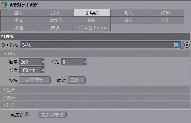 “引导线”选项卡用于设置毛发引导线的相关参数。通过引导线,能直观地观察毛发的生长效果,如图所示。