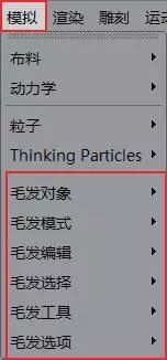 “模拟”菜单列出了与毛发相关的命令,如图所示,这些命令不仅可以创建毛发,还可以对毛发进行属性的修改。