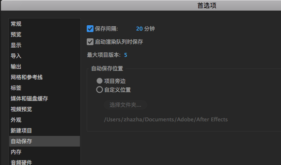 这个不是难点,但是一个很要命的步骤,用的人都知道这个功能,但很少有人特意去设置,AE本身就是一个娇小姐,加上国内使用的破解版居多,系统更加不稳定,一个字体或者命令执行错误都能让你前功尽弃,所以根据自己的项目复杂度设置保存间隔和版本是很有必要的。