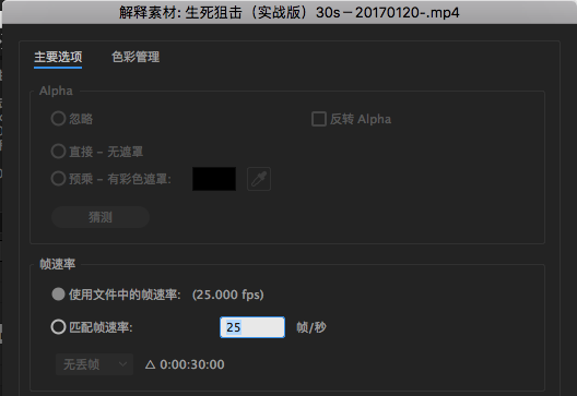 右键点击素材-解释素材,对话框如图: