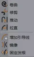 “ 模拟-毛发工具 ”菜单中列出了编辑毛发的工具,可以对毛发进行卷曲、拉直等操作,如图所示。