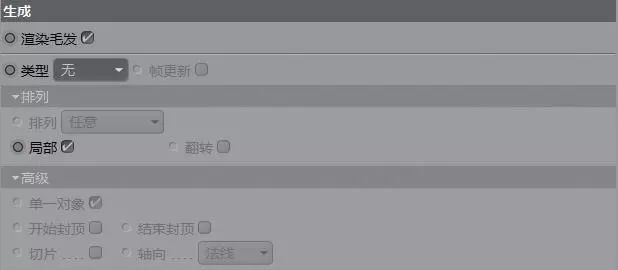“生成”选项卡用于设置渲染毛发的形状,可以是预设形状,也可以是实例对象或扫描图形,如图所示。