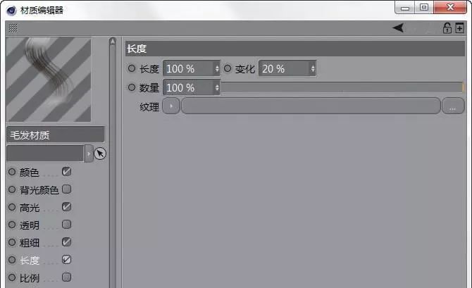 当创建毛发模型时,会在材质面板自动创建相对应的毛发材质。双击毛发材质会打开“材质编辑器”,如图所示。比起普通材质的材质面板,毛发材质的属性更多。