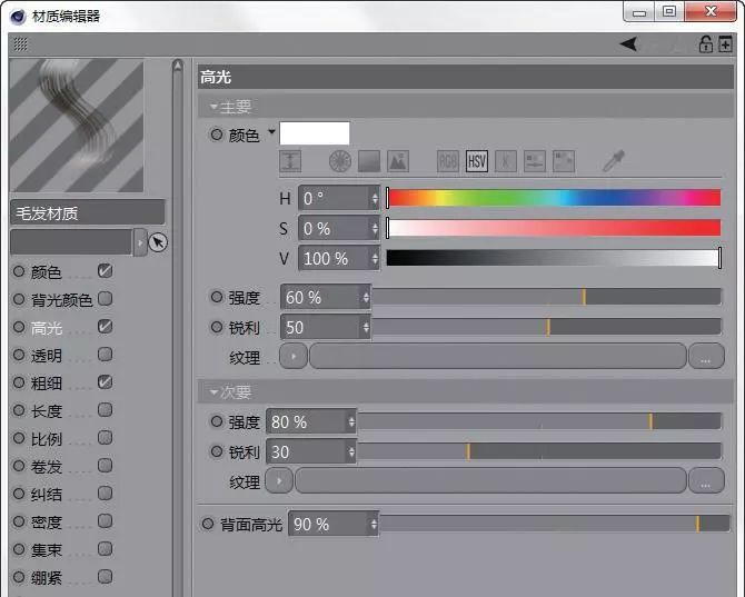 颜色:设置毛发的高光颜色,白色表示反光为最强。