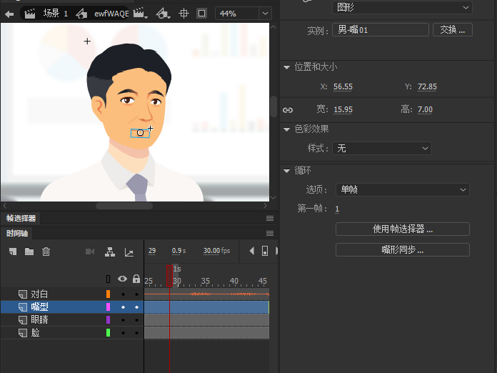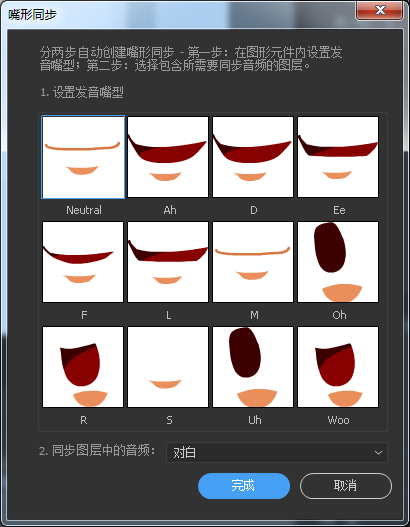选中元件,打开相应的“嘴型同步”面板,将关键帧一一对应上,点击完成关闭面板。