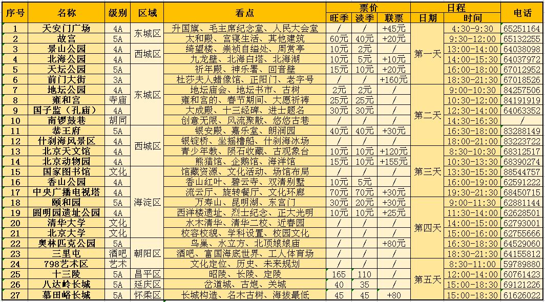 | 博物馆 | 首都博物馆 | / | / | 门票提前7天预售(并不是只能预约7天后的名额),也可于参观前一天预约,售完为止,旺季推荐提前预约。 | 预约 |