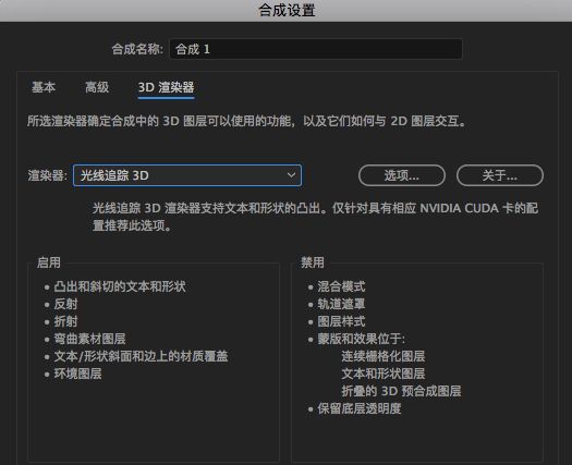 2、光线追踪:NVDIA CUDAf电脑显卡推荐此渲染器,渲染精度更好,支持文本和形状的凸出,但会增加渲染的时间;其次光线追踪3D图层景深要比经典3D更佳准确,并且使用追踪品质来控制运动模糊外观。